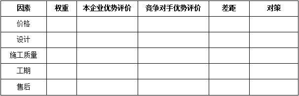 F、關(guān)鍵成交因素對(duì)比:對(duì)于某一個(gè)細(xì)分領(lǐng)域的客戶而言,成交的關(guān)鍵因素選項(xiàng)是相對(duì)清晰的,而這些因素對(duì)成交的影響權(quán)重是不同的,經(jīng)營(yíng)分析就需要識(shí)別競(jìng)爭(zhēng)對(duì)手在哪些關(guān)鍵成交因素上占據(jù)優(yōu)勢(shì)。例如:對(duì)于裝飾裝修工程行業(yè)的家庭客戶而言,其成交因素包括:價(jià)格、設(shè)計(jì)、施工質(zhì)量、工期、售后的維修維保服務(wù)等。對(duì)于一個(gè)收入中等的自住新房客戶而言,價(jià)格、設(shè)計(jì)因素、施工質(zhì)量是其主要成交因素,而對(duì)于商鋪、投資房產(chǎn)來(lái)說(shuō),工期的重要性不言而喻。如下表: